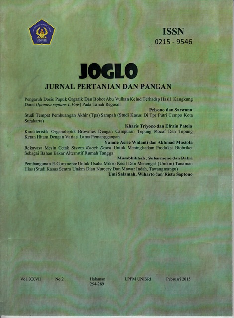 Pengembangan produk olahan pangan dengan bahan baku hasil pertanian lokal perlu terus dikembangkan untuk mengurangi ketergantungan kepada bahan pangan impor. Tepung Mocaf ( Modified Cassava Flour ) merupakan tepung singkong yang dimodifikasi melalui fermentasi sehingga menghasilkan tepung yang memiliki karakteristik yang hampir sama dengan tepung terigu. Sedangkan tepung ketan hitam telah lama dikenal sebagai sumber antioksidan yang berasal dari pigmen anthosianin. Tepung ketan hitam juga telah digunakan dalam berbagai produk olahan pangan. Selain sebagai upaya diversifikasi, penggunaan tepung ketan hitam juga bertujuan untuk meningkatkan kadar antioksidan suatu produk pangan. Penelitian ini bertujuan mengembangkan produk brownies panggang menggunakan campuran tepung mocaf dan tepung ketan hitam. Perbandingan tepung mocaf dan tepung ketan hitam yang digunakan adalah 1:1, 1:2, dan 2:1 dengan variasi waktu pemanggangan selama 45, 60, dan 75 menit. Selanjutnya ingin diketahui pula karakteristik organoleptik brownies yang dihasilkan. Sifat-sifat organoleptik yang diuji terdiri dari warna, aroma, rasa, tekstur, dan kesukaan secara keseluruhan. Uji organoleptik akan melibatkan 15 orang panelis terlatih dengan metode pengujian Scoring Difference Test. Selanjutnya pengolahan data dilakukan dengan Anova pada tingkat signifikansi 5%. Jika terdapat perbedaan yang nyata antar sampel , dilanjutkan dengan uji DMRT pada tingkat signifikansi 5%. Nilai rerata yang diperoleh dari tiap parameter organoleptik akan digunakan untuk menggambarkan profil organoleptik produk melaui star chart diagram.Kata Kunci : brownies, tepung mocaf, tepung ketan hitam, lama pemangganganDownloads